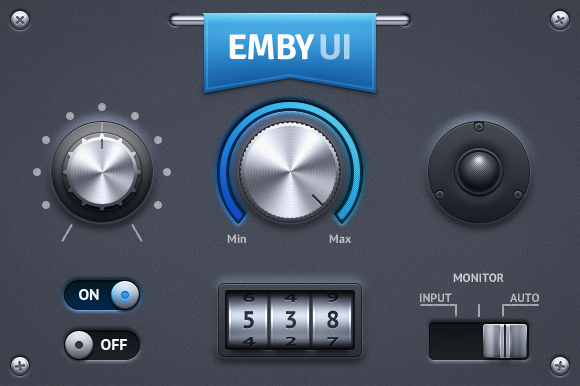 Emby UI contains knobs, counter, volume meters, speakers, light bulbs, color selector, gamepads, ribbon, scroll wheels, equalizer, switches, tumblers, audio inputs, cd, vinyl, sound bars, steps meter, buttons, sliders, progress bars, player controls, range selector.