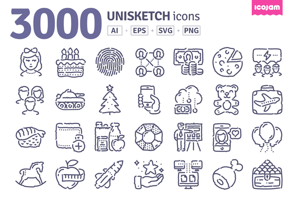 Unisketch contains 3000 vector icons divided into following categories: Achievements & Badges, Appliances, Baby, Basic, Biology, Buildings, Clothing & Accessories, Design, Devices, Finance, Food, Fruits & vegetables, Holidays, Human, Interior, Layout, Maps & Travel, Mechanics, Military, Multimedia, Nature, Security, Science, Sport, Symbols & Arrows, Tools, Vehicles, Weather.