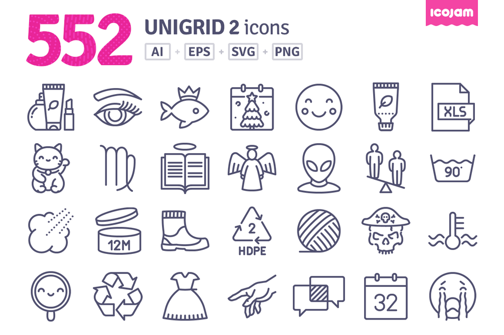 Unigrid contains 3552 outline vector icons divided into following categories: Achievements & Badges, Appliances, Baby, Basic, Biology, Buildings, Clothing & Accessories, Design, Devices, Finance, Food, Fruits & vegetables, Holidays, Human, Interior, Layout, Maps & Travel, Mechanics, Military, Multimedia, Nature, Security, Science, Sport, Symbols & Arrows, Tools, Vehicles, Weather, Clothes & Shoes, Halloween, Packing signs, Car Dashboard signs, Washing machine signs, Laundry signs, Astrology, Religious, Culture, Calendar, File extensions, Emoji, Makeup.