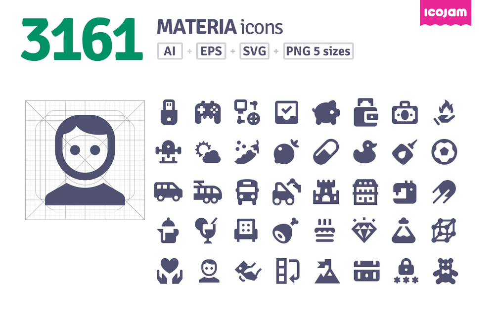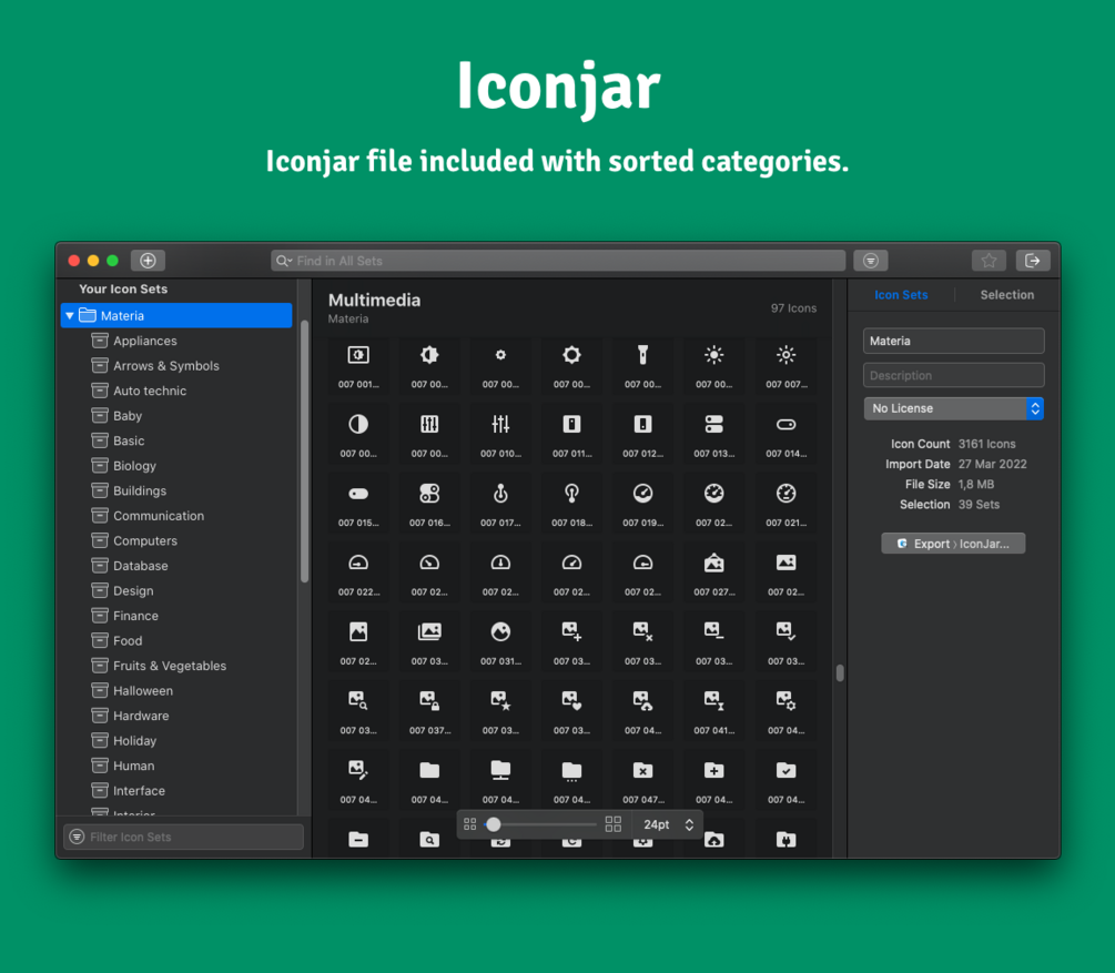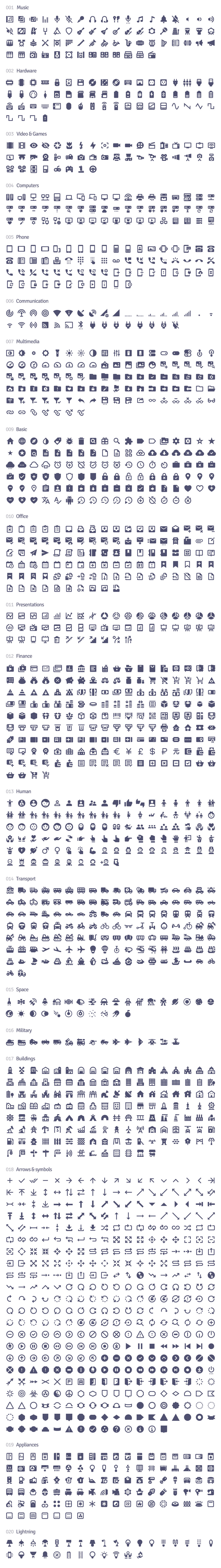 Materia contains icons divided into following categories: appliances, arrows & symbols, auto technic, baby, basic, biology, buildings, communication, computers, database, design, finance, food, fruits & vegetables, halloween, hardware, holiday, human, interface, interior, kitchen, lightning, maps & travel, military, multimedia, music, nature, office, phone, presentations, science, security, social_free, space, sport, tools, transport, video & games, weather.